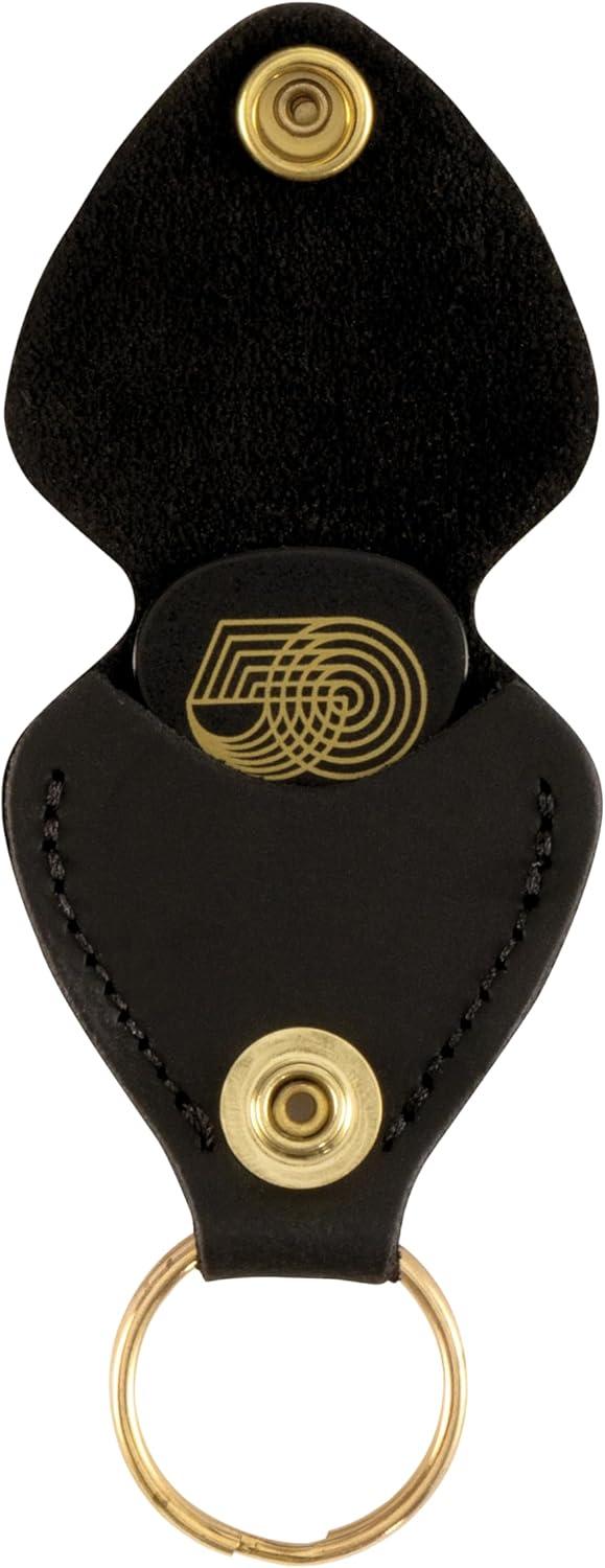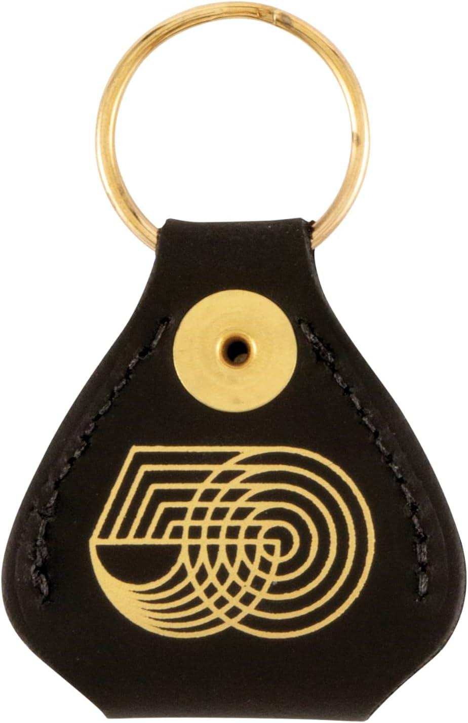 Our 50th Anniversary black leather pick holder keychain features the original D'Addario logotype in gold on the front, with our gold 50-Mark on the back. Includes a set of two limited run classic Celluloid Picks and a metallic sticker.