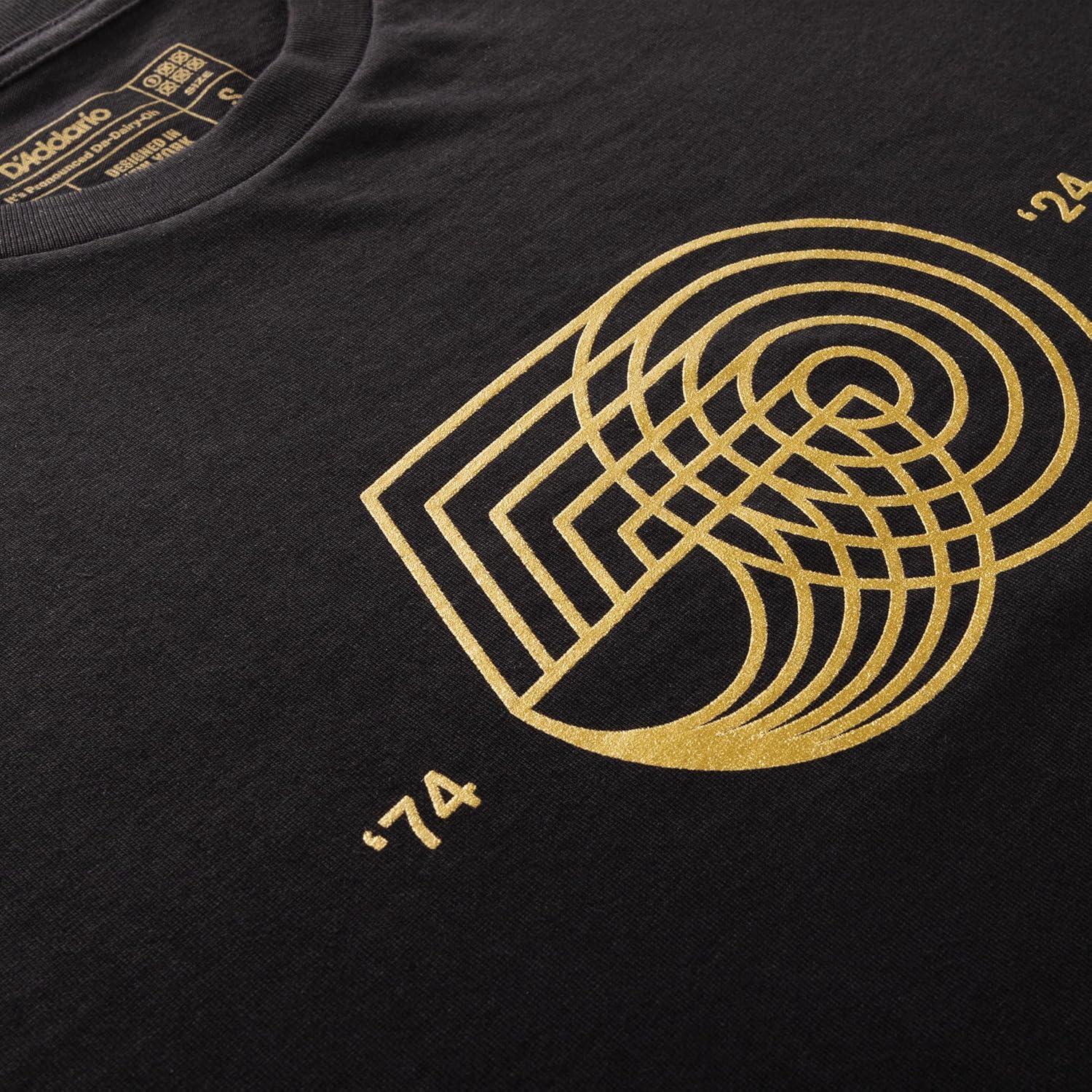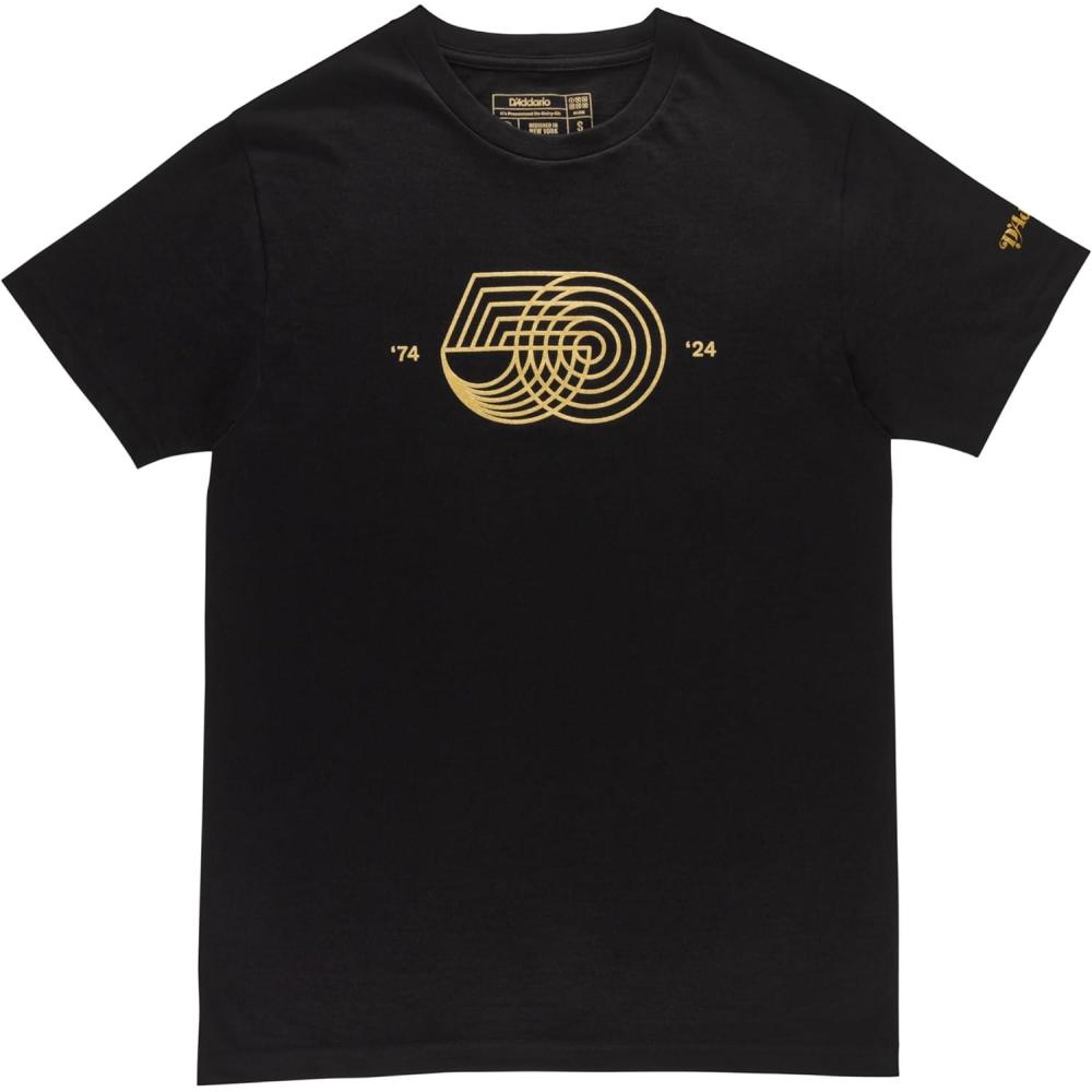 Our 50th Anniversary t-shirt features the string-inspired 50-Mark printed in metallic gold on the front, and our original D'Addario logotype on the sleeve. Limited Edition of 500.