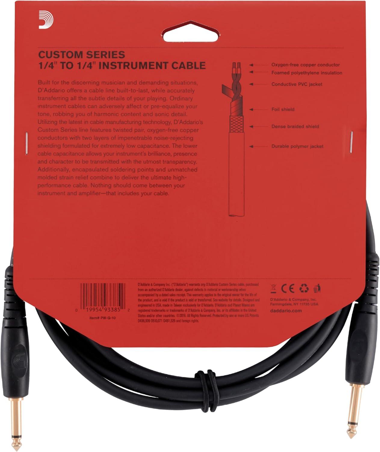 Planet Waves Custom Series Instrument Cables feature gold plated connectors for superior signal flow and corrosion resistance. The 10-foot length is ideal for shorter runs, such as guitar-to-pedalboard, and smaller stages.