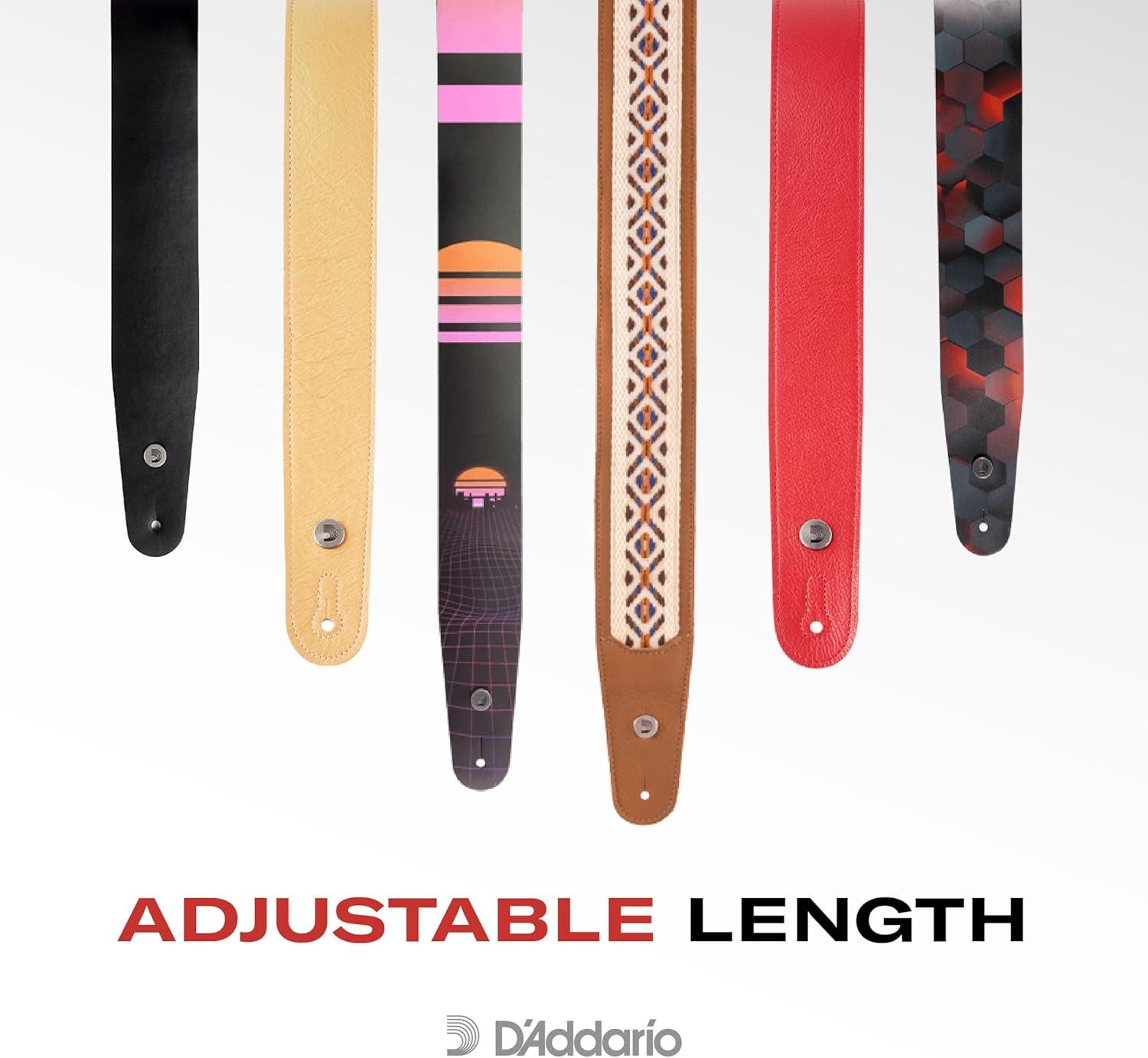 Show off your playing speed with the Racing Stripes leather guitar strap. The D'Addario Deluxe Series sets the standard for leather straps. From basic single-ply styles to two-ply garment leather straps with soft suede backing, the Deluxe Series exudes class, style, fashion and function. The body of the straps is 4″ longer than standard straps, giving you maximum adjustability from 44.5″ to 53″ long.