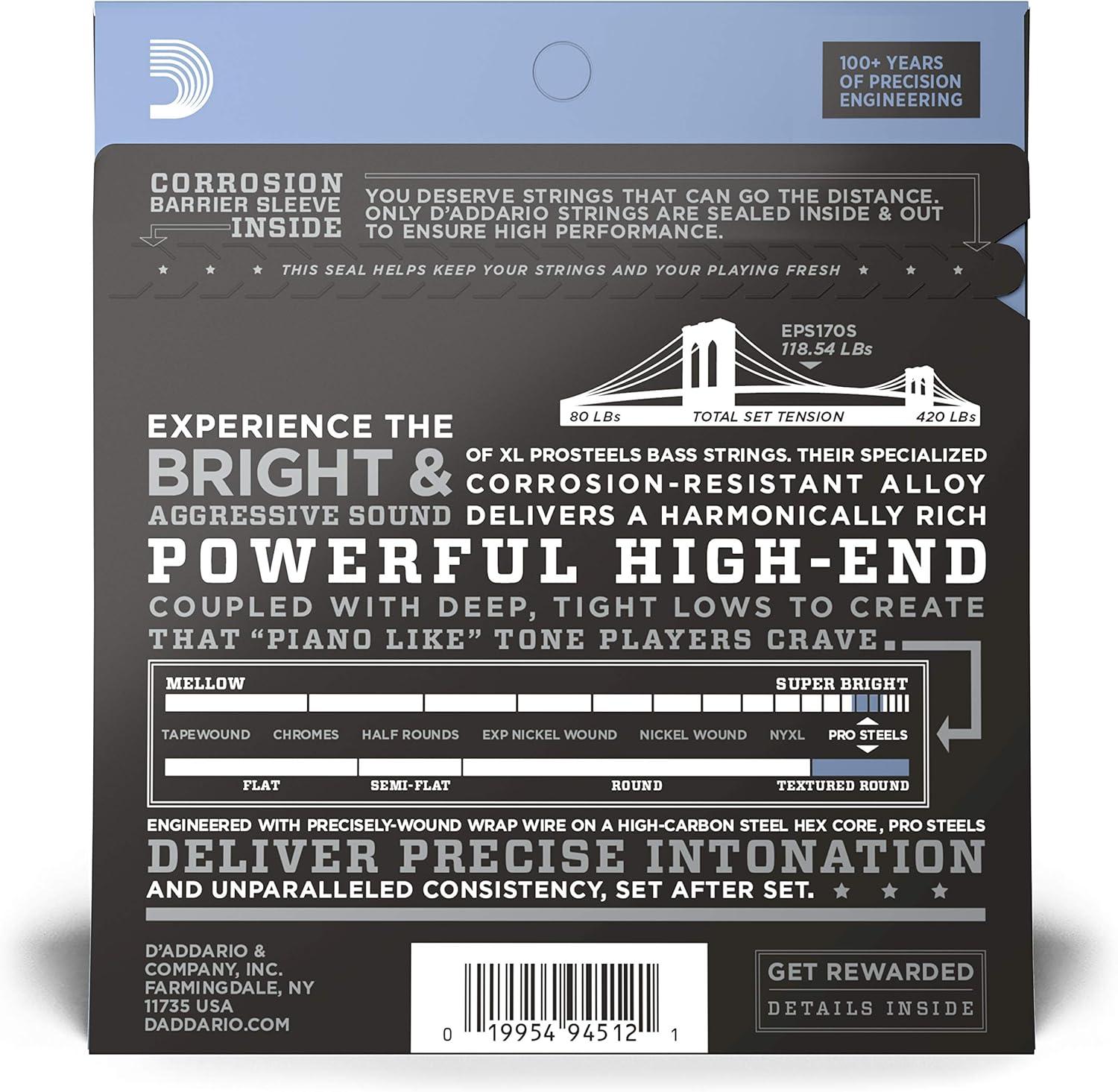D’Addario Bass Guitar Strings, XL Pro Steels, EPS165, Long Scale, Regular Light Top/Medium Bottom Gauge 45-105, 4-String Set, Pack of 1(Super Long Scale)