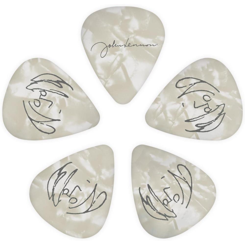 Strum along with a legend using these John Lennon signature picks by D'Addario. Nine picks in the pack feature the Jacquard design from the guitar strap he used at the infamous rooftop performance at Apple Corps in London. One pick has Lennon’s classic cartoon self-portrait on one side and his distinct signature on the other. Commemorate the Beatles’ final public performance and the beginning of John’s iconic solo career with these unique picks.