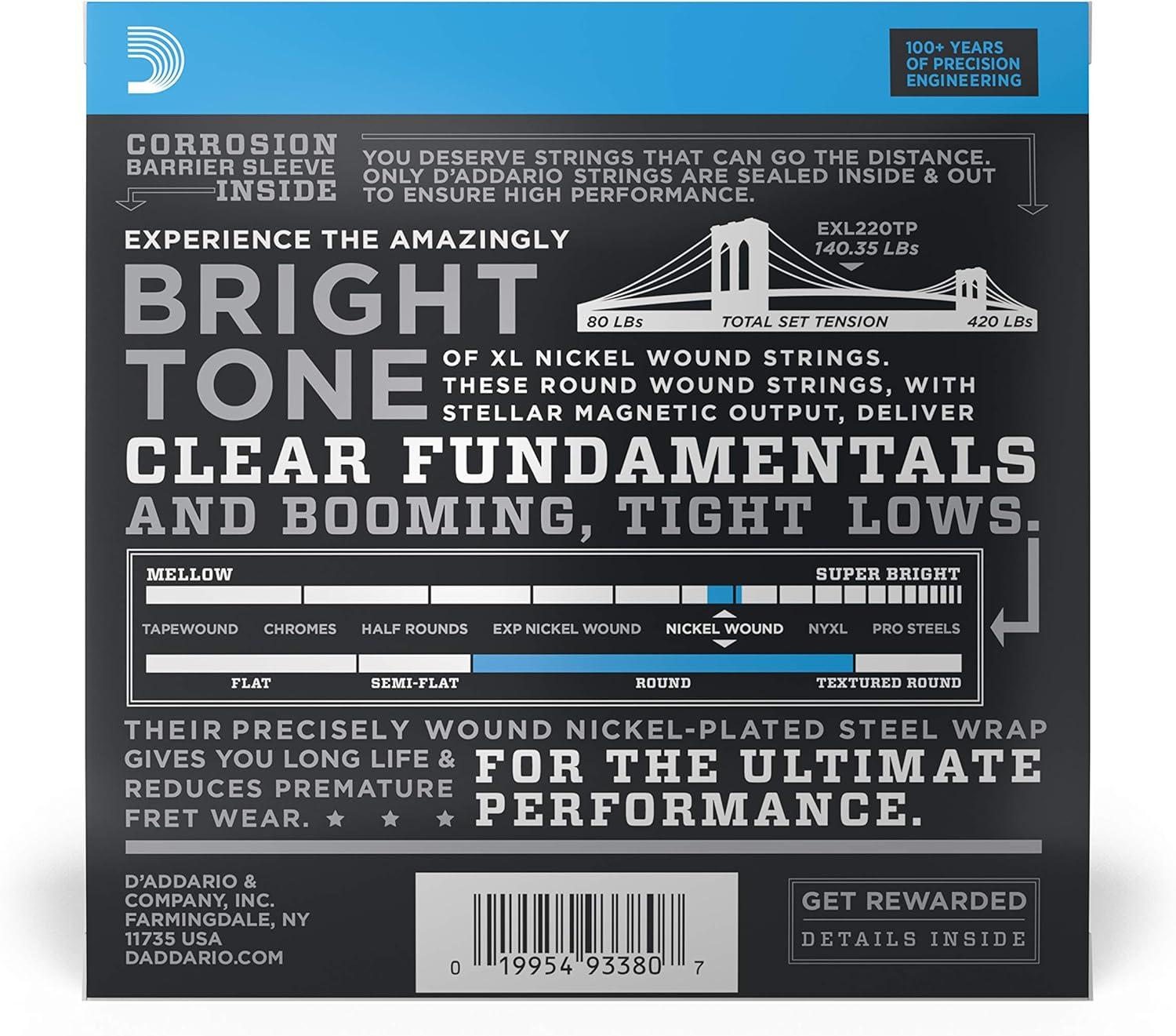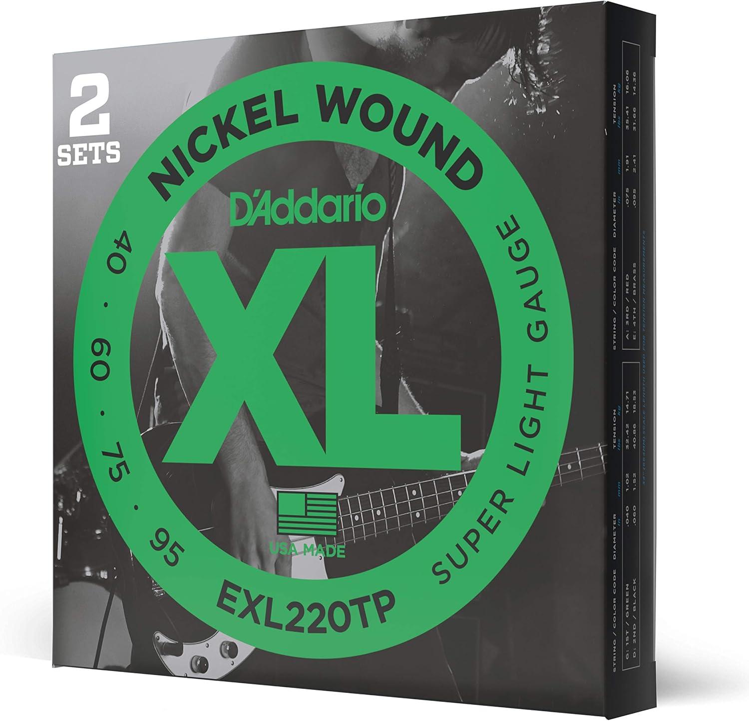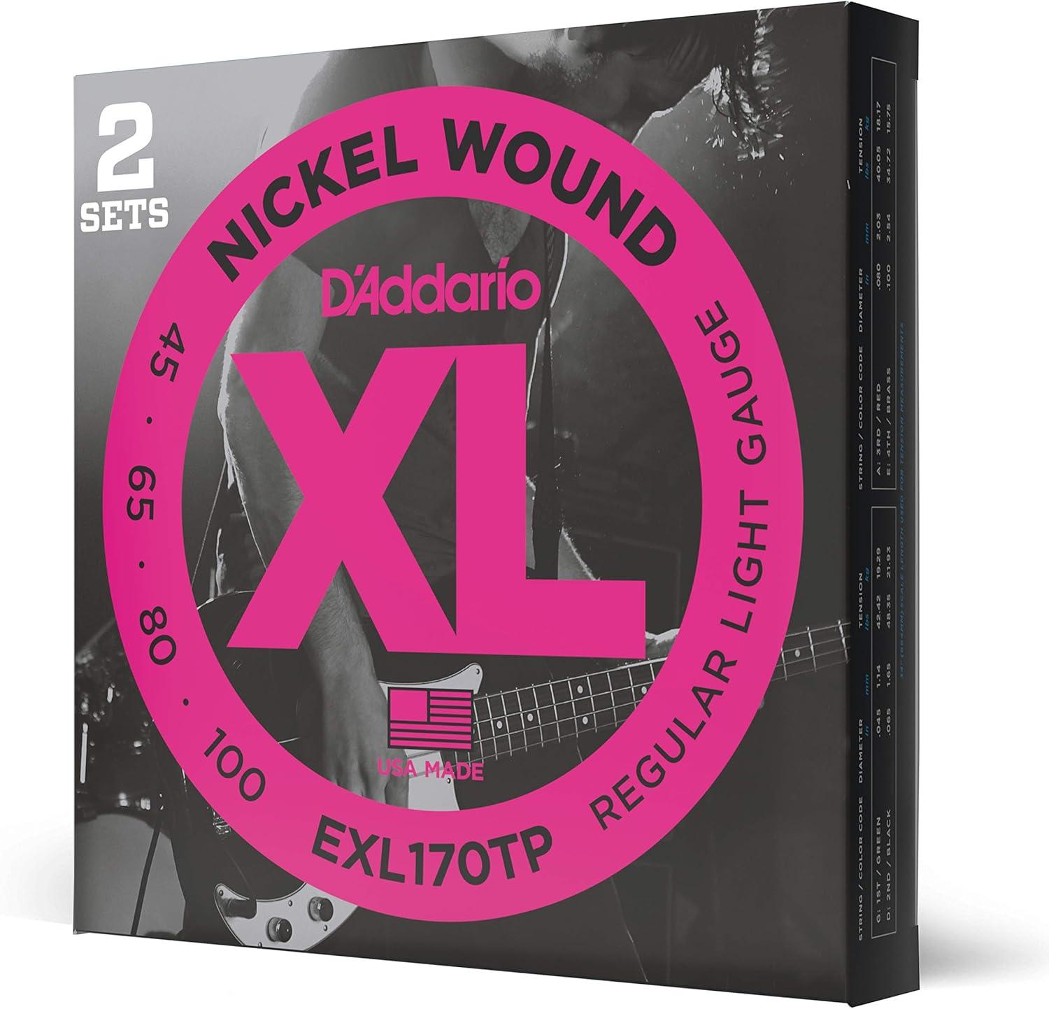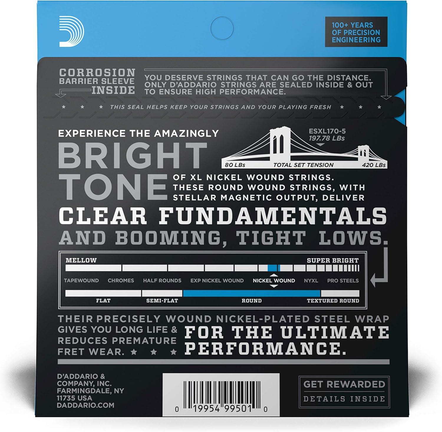 D'Addario XL Nickel Wound Electric Bass strings are world-renowned as “The Player's Choice” amongst bass players of all genres and styles. All XL strings are precision wound on our exclusive digitally-controlled machines, ensuring each string has excellent intonation, clear fundamentals, and unparalleled consistency. Each string is wound with a nickelplated steel wrap wire known for distinctive bright tone with excellent magnetic output delivering a universally appealing and versatile tone for all playing styles.