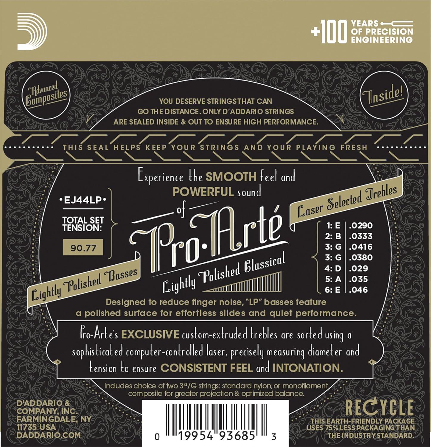 Pro-Arte lightly polished composite strings feature an exclusive multifilament core material which delivers a powerful, but warm tone which lasts 2-3 times longer than traditional classical strings. Each wound string is polished to a smooth surface for reduced finger noise. In addition to three traditional nylon treble strings, each set contains an optional monofilament composite 3rd/G string, which provides greater projection and optimal balance between basses and trebles. All Pro-Arte treble strings are sorted by a sophisticated computer-controlled laser machine which performs diameter/tension measurements and quality checks, ensuring true sounding, precise trebles in every set. Pro-Arte lightly polished sets are also ideal for recording.