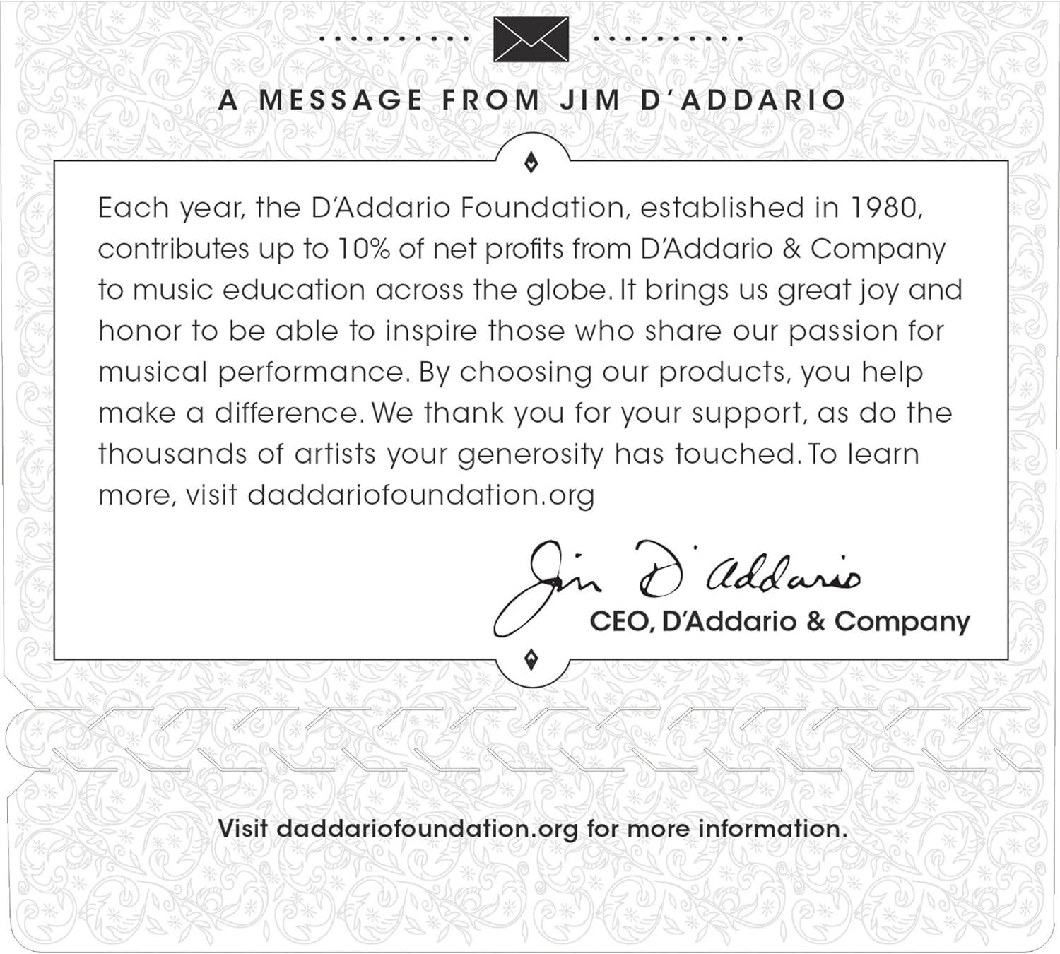 D'Addario, the world's largest manufacturer of musical instrument strings, is known as The Players Choice with a reputation for unsurpassed quality and consistency. D'Addario's innovative packaging reduces waste and provides protection from corrosion. All D'Addario strings are manufactured in the U.S.A. using proprietary, digitally controlled, state-of-the-art machinery for unmatched performance, set after set.