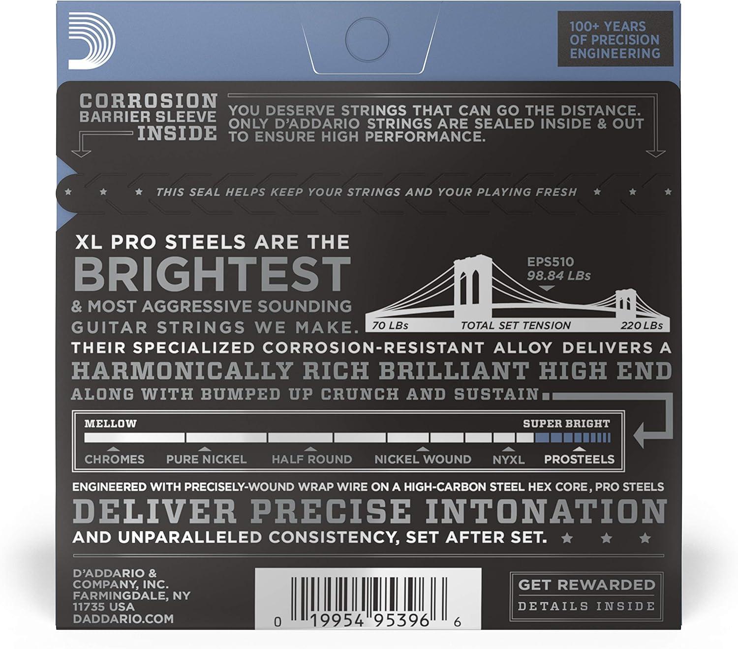 D'Addario Guitar Strings - ProSteels Electric Guitar Strings - Round Wound - Brighter, Crunchier, Increased Sustain - EPS540 - Light Top/Heavy Bottom, 10-52(10-46)
