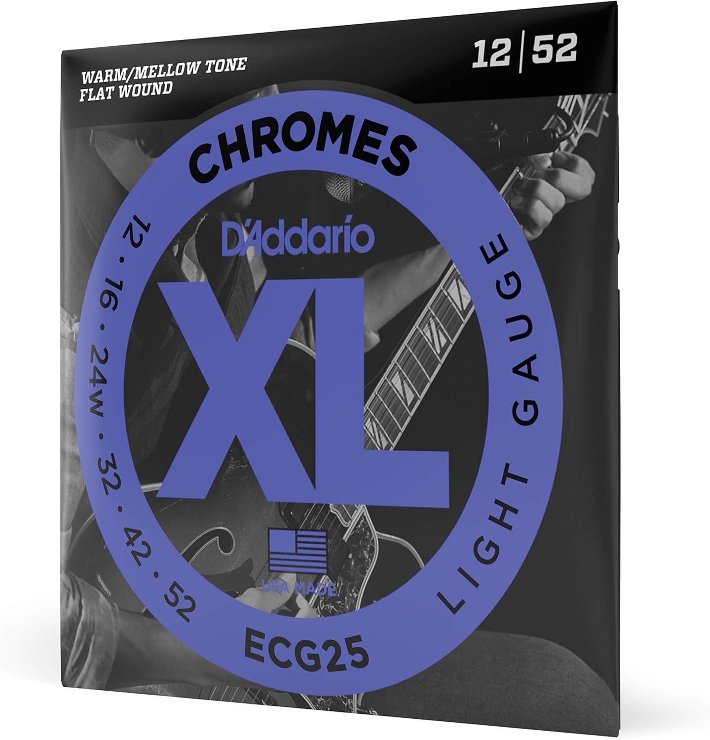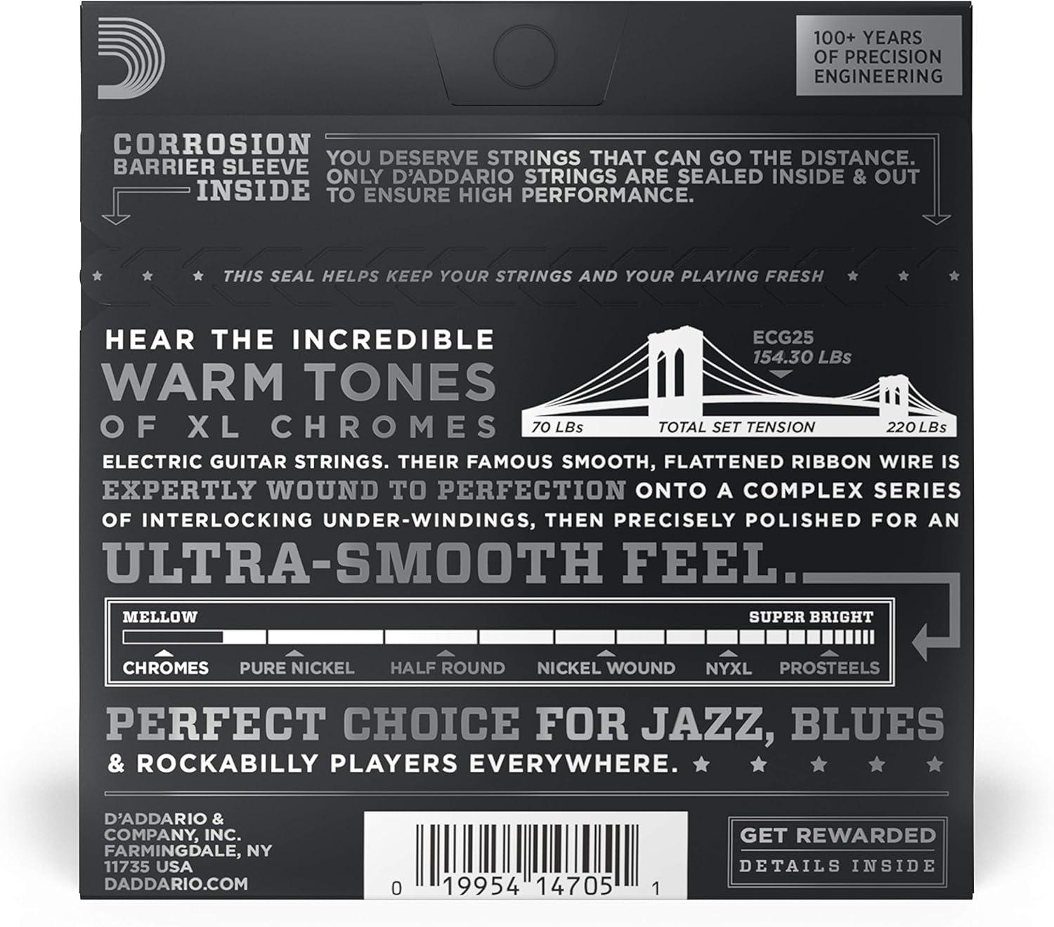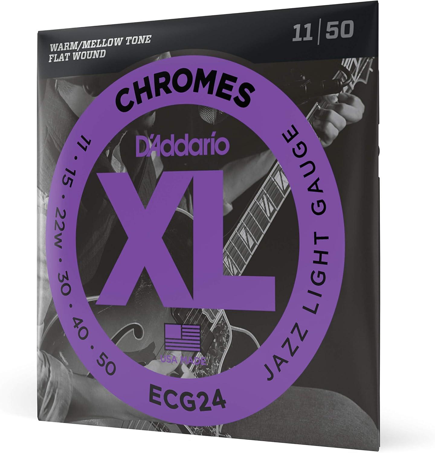 ECG24, D'Addario's best selling gauge of flatwound strings, delivers a balance of smooth feel, warm/mellow tone and optimal tension, ideal for traditional jazz, rockabilly twang, R&B and some pop/rock styles.