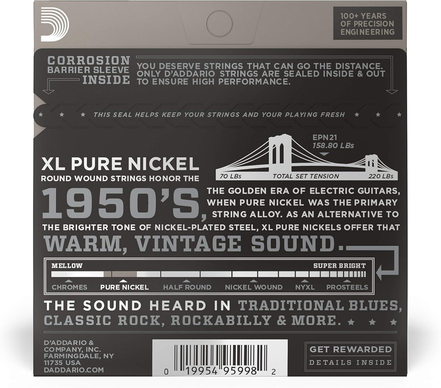 D'Addario XL Pure Nickel strings look back to the '50s, when nickel was the primary alloy found in electric guitar strings. Pure nickel strings would be supplanted by nickelplated steel in the '60s when guitarists required brighter tone and enhanced magnetism. Pure Nickel brings back the richer, warmer timbres found in traditional blues, classic rock, rockabilly, and more.
