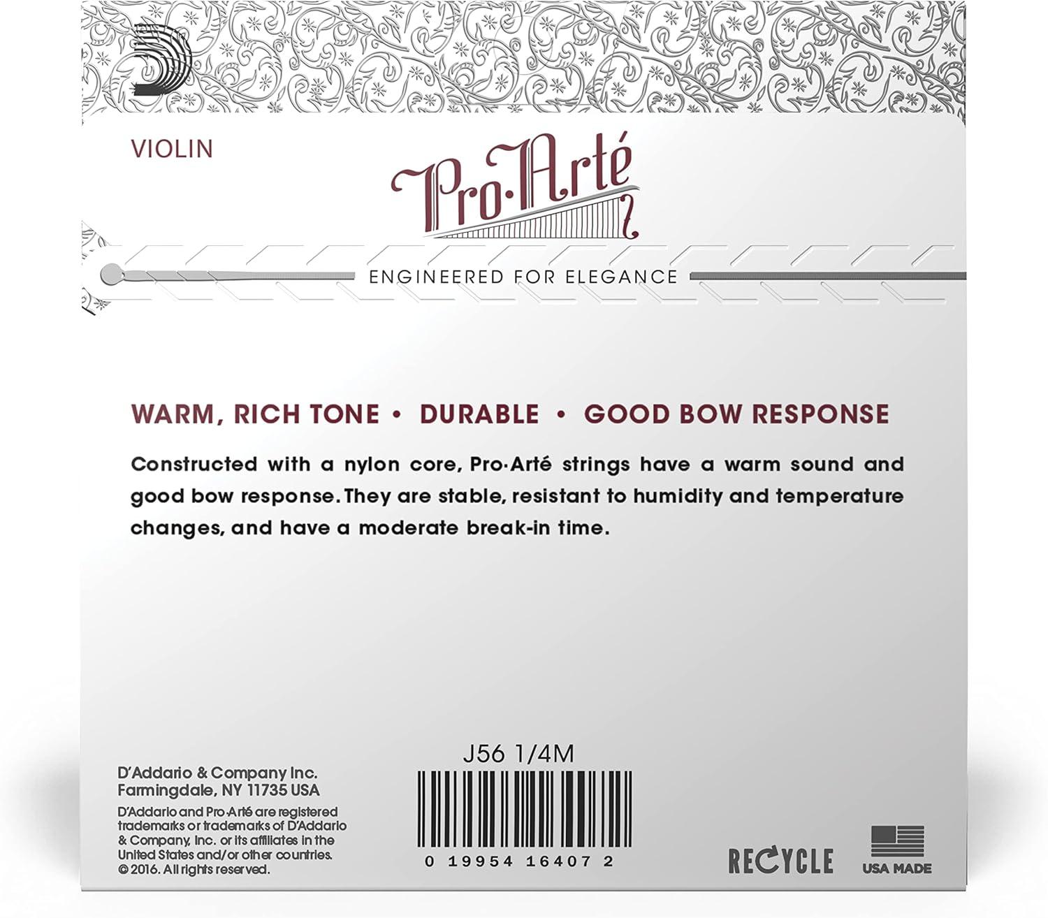 Pro-Arte synthetic core violin strings have a warm, mellow tone. They are less sensitive to humidity and temperature changes, and break in quickly. Pro-Arte strings are designed at a lower tension in order to maximize bow response, tonal blend and playability. A good choice if a warmer, darker tone than steel strings is desired. The 3/4 scale strings are gauged specifically for 3/4 size violin with a playing length of 12 1/4 inches (310mm).