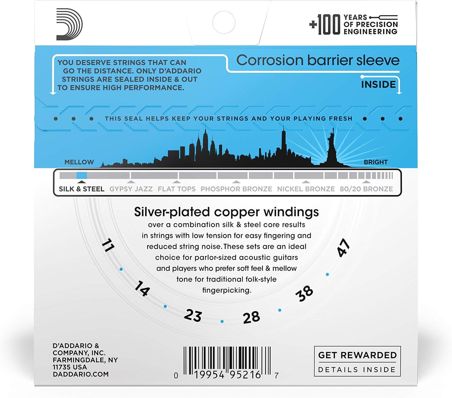 Silk and Steel were uniquely designed to be our warmest, mellowest acoustic guitar string. Ideal for parlor guitars and vintage instruments, the softened tone of Silk & Steel is often preferred by folk players. Made with silver-plated copper windings, over a combination silk and steel core, the low tension and reduced finger noise of Silk & Steel is well suited for mellow acoustic vibes and fingerstyle playing. This 11-47 Light set is easy to play and provides a warm tone.