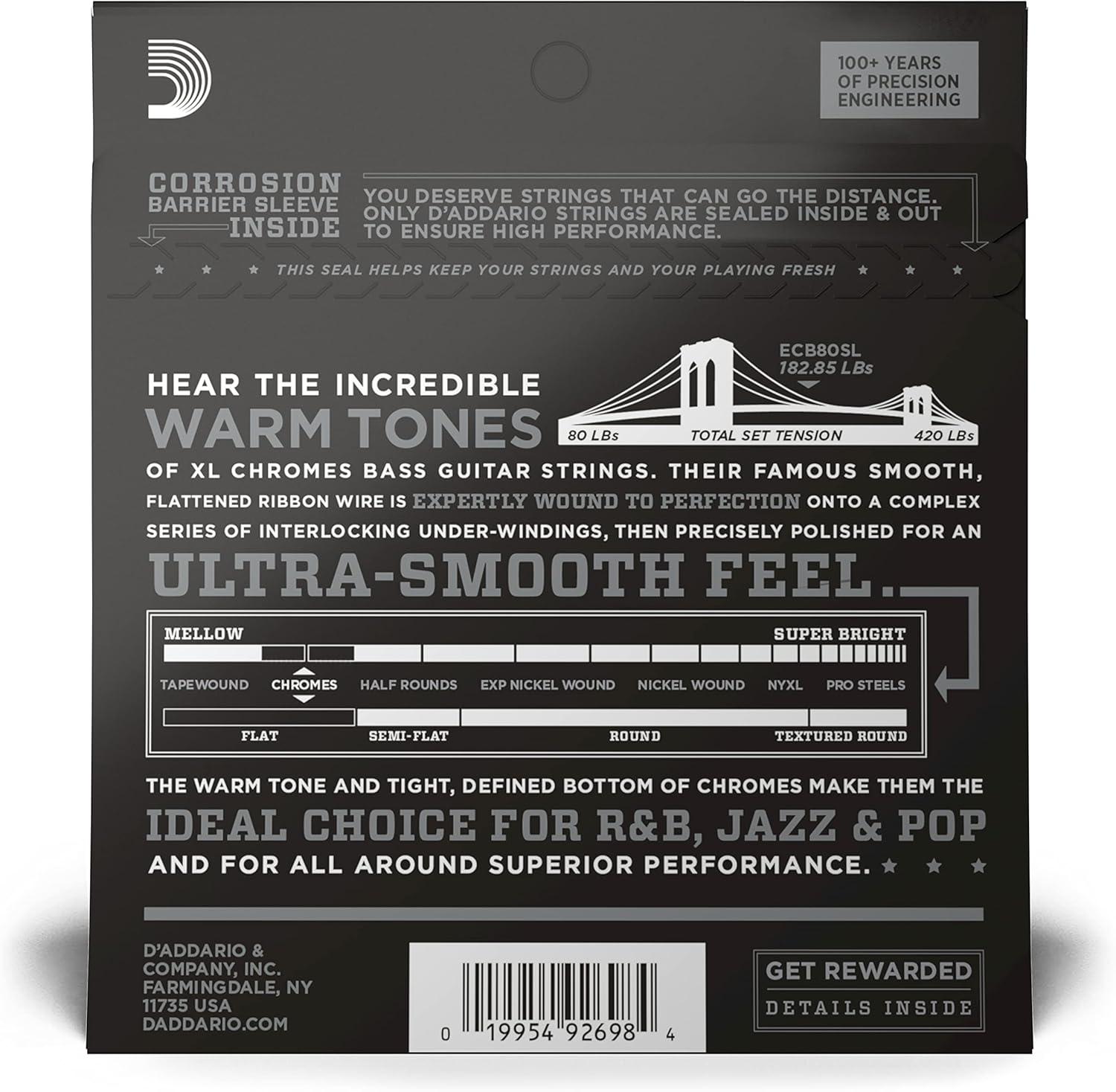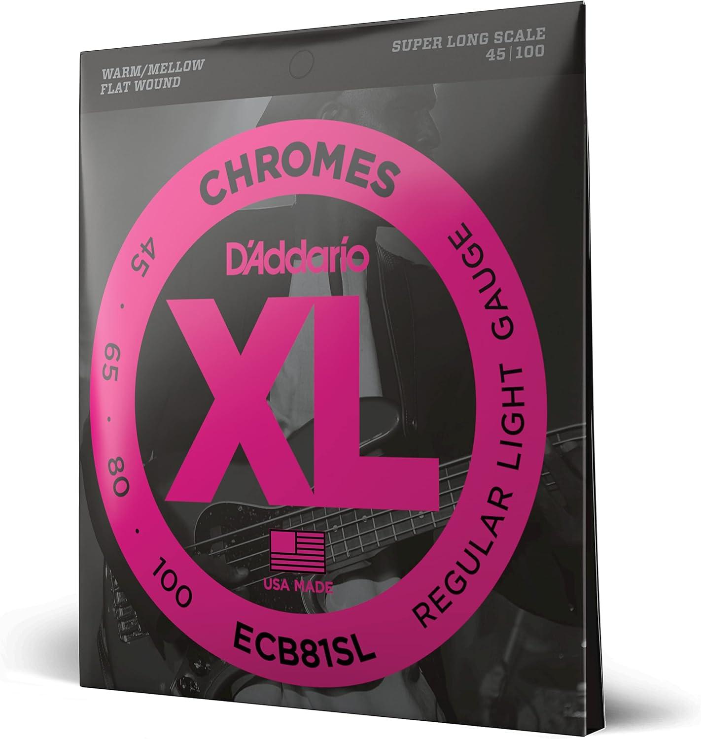 D’Addario XL Chromes Flat Wound Bass Guitar Strings – ECB81 – Long Scale – Regular Light, 45-100(Super Long Scale)
